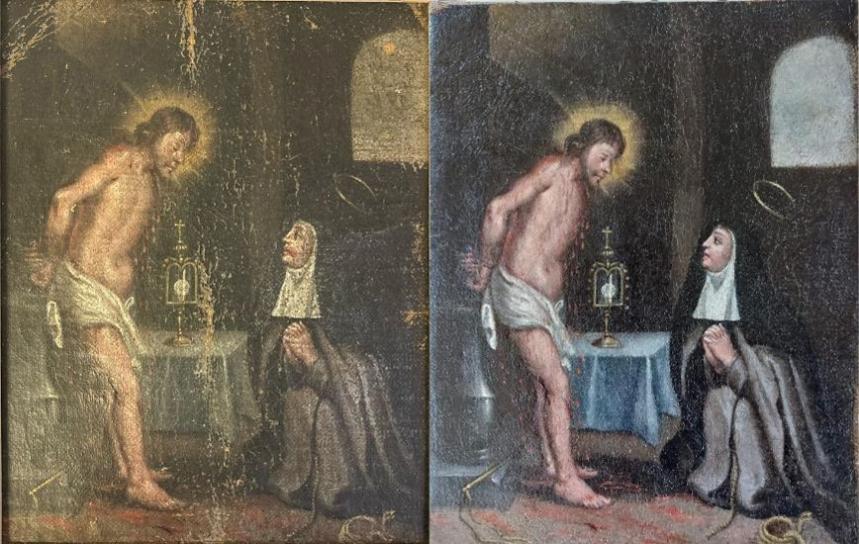 Op het eerste zicht lijkt het maar een banaal schilderijtje. Het is amper 26 op 21 cm groot en geschilderd in de 17de eeuw. Toch verbeeldt het op een heel mooie wijze een belangrijk aspect in de extatische beleving van vrouwelijke religieuzen: een sterke verbondenheid met het sacrament. In een donker interieur zit de Heilige Clara. Op de tafel voor haar staat een monstrans met daarin een hostie. Terwijl ze het sacrament aanbidt, verschijnt de gegeselde Christus. Net omwille van die iconografie wordt het schilderij getoond in de expo ‘Ecstasy & Orewoet’.