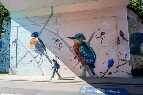 If you walk all the way around the ponds, at the railway bridge on Hoegaardsestraat, you come face to face with the enchanting street art of artists’ collective Treepack. In a style reminiscent of fairy-tale books, you stroll past the fauna and flora of the Park Abbey ponds. More than 100 local residents contributed to this participative street art project.